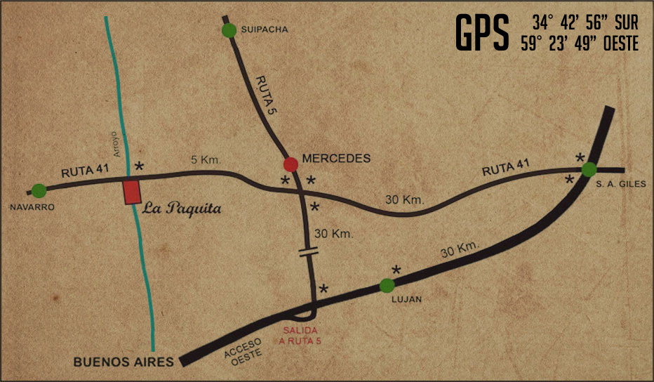 En el tramo que une Mercedes con Navarro, a cinco kilómetros del puente que une la ruta 5 con la ruta 41. GPS: 34° 42´ 56˝ Sur 59° 23´ 49˝ Oeste.